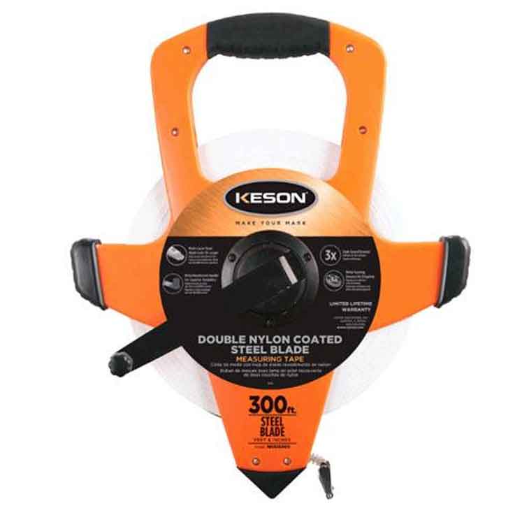 Keson nylon-coated steel tapes are constructed with a double layered .2mm nylon, permanently bonded over a center core of 13mm steel. Our multi-layer construction assures corrosion resistance (even to salt water) and provides at least three times the usual tape life.