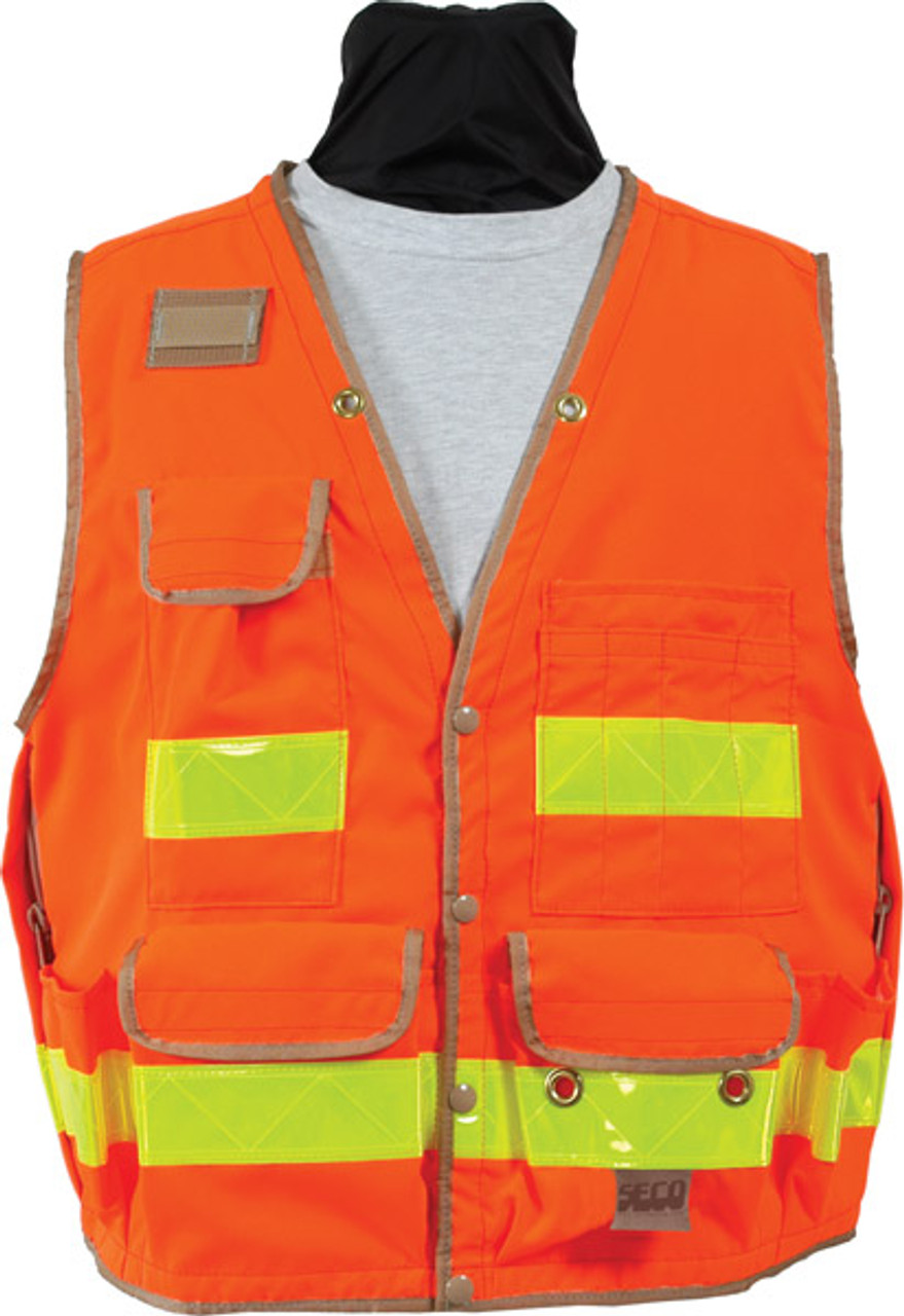 The Seco 8068-Series Class 2 Lightweight Safety Utility Vest offers visibility and safety on the job site. It is designed to comply with DOT MUTCD and ANSI/ISEA 107-2004 Class 2 standards for high-visibility safety apparel. The Seco 8068-Series features stripes of reflective tapes that are two inches wide, a large adjustable backpack pocket, and multiple exterior and interior pockets.