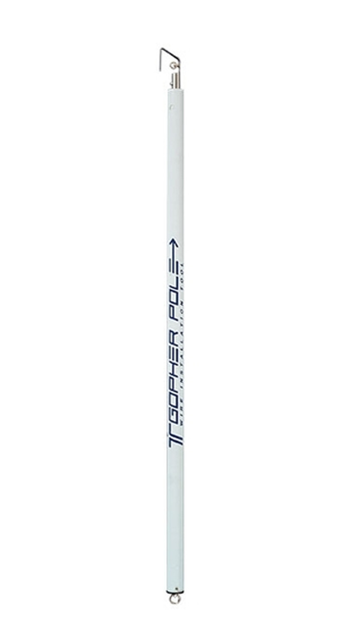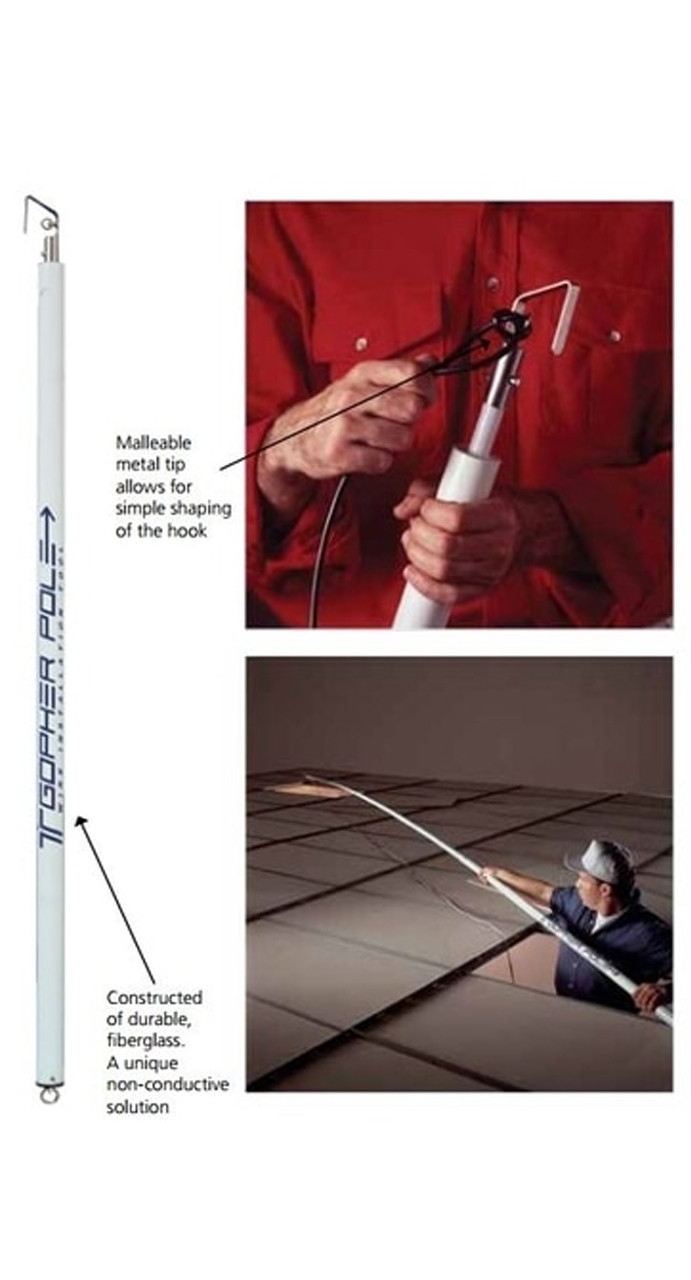 The Gopher Pole is ideally suitedfor pushing/pulling wire over longspans and acoustic ceiling tiles telescoping from 4 to 22 feet(1.22 to 6.70 meters) in secondsand is easy to handle in tight spots. Features a malleable metal tip thatallows for easy shaping of the hook. The metal hook will not breakunder normal use. This telescoping wire pulling pole is sturdy and lightweight with no loose parts and is constructed of durable non-conductive fiberglass. This gopher tool also features a positive-locking system that won’t accidentally collapse.