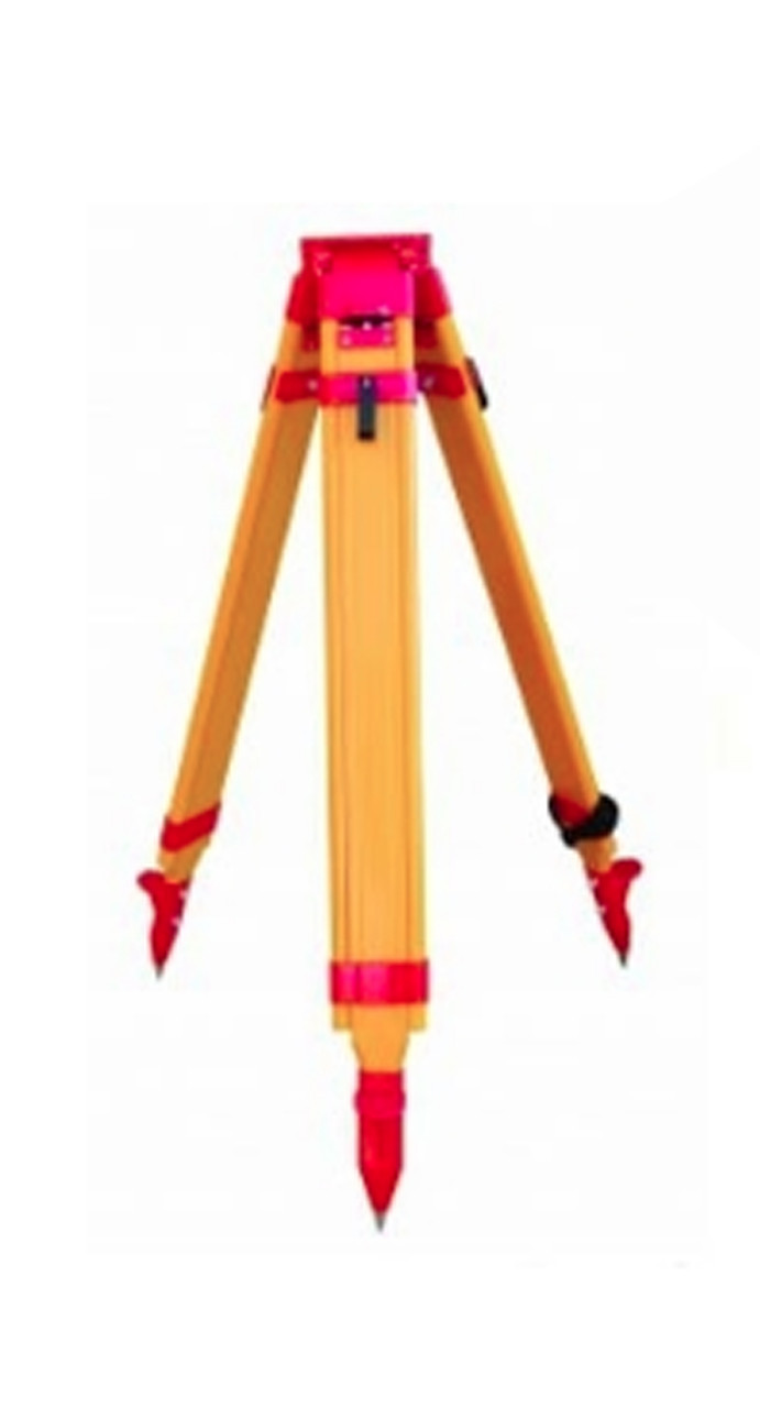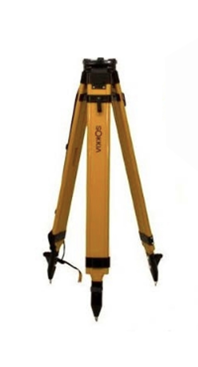 The Sokkia Heavy-Duty Wood Fiberglass Tripod has a standard 5/8×11 thread with telescoping yellow legs and black or orange hardware.