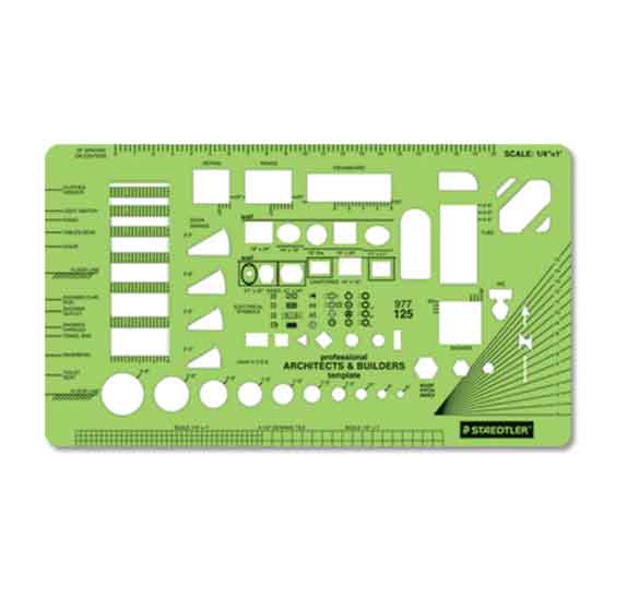 Staedtler® Mars® Architect template measuring 9 1/4″ x 5 1/4″ is made of strong durable green plastic with matte-finish to reduce glare. Template features 56 geometric shapes and scale for more convenience.
